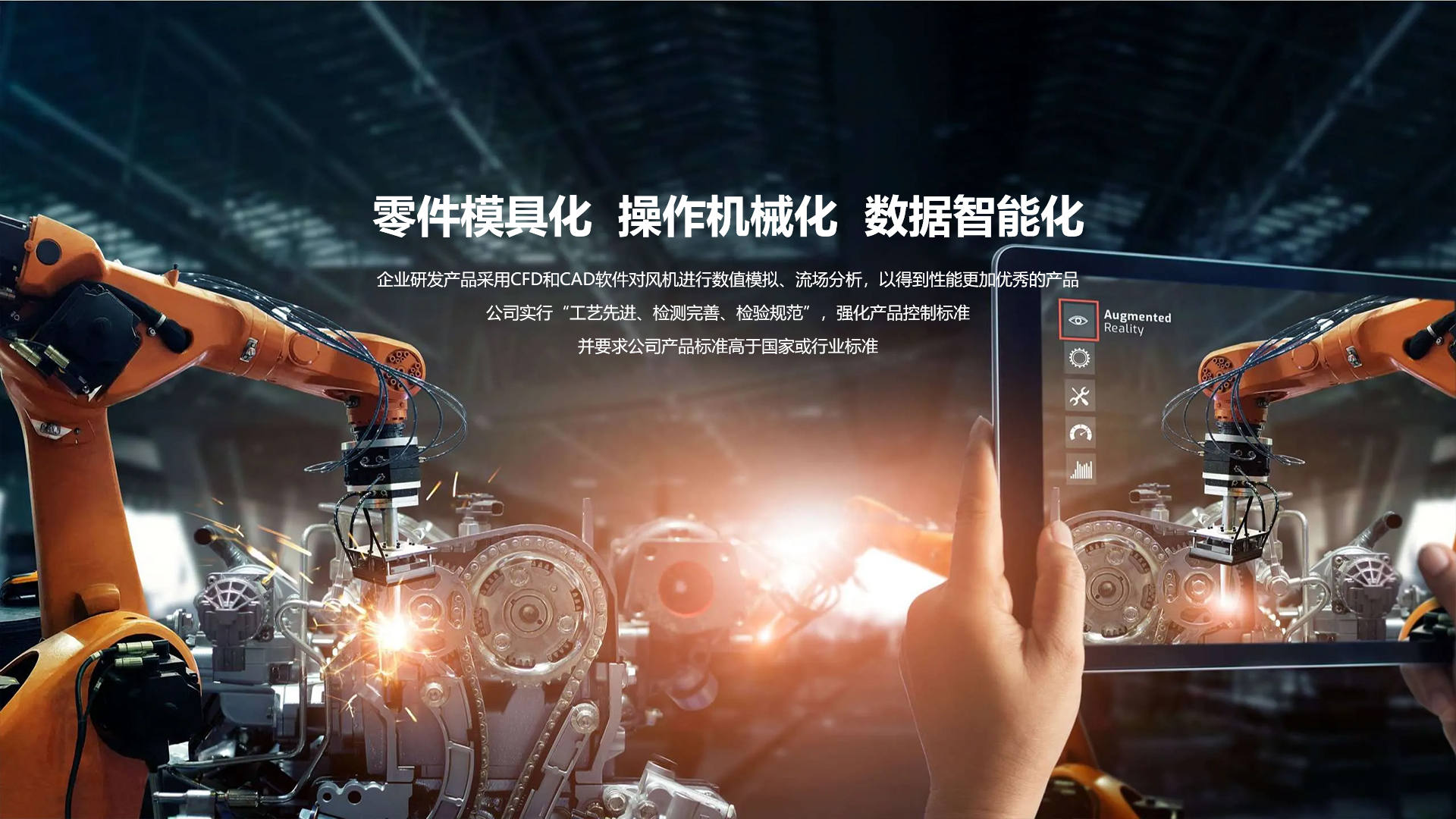 • 隨著勞動力市場日益嚴峻,公司每年投入財力和物力,向零件模具化、操作機械化,數據智能化上發展。企業研發產品采用 CFD 和 CAD 軟件對風機進行數值模擬、流場分析,以得到性能更加優秀的產品。公司實行“工藝先進、檢測完 善、檢驗規范”,強化產品控制標準;并要求公司產品標準高于國家或行業標準。